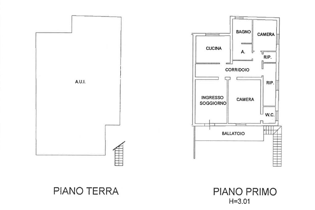 Piano primo: appartamento con soggiorno, cucina abitabile, due camere da letto e due bagni.