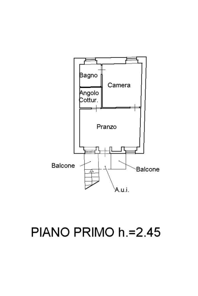 Primo piano: zona giorno con soggiorno e cucina a vista, una camera da letto, bagno e scala interna di collegamento.