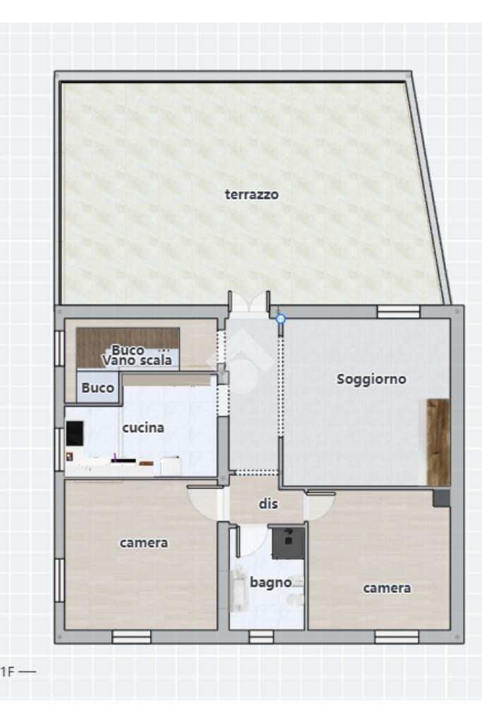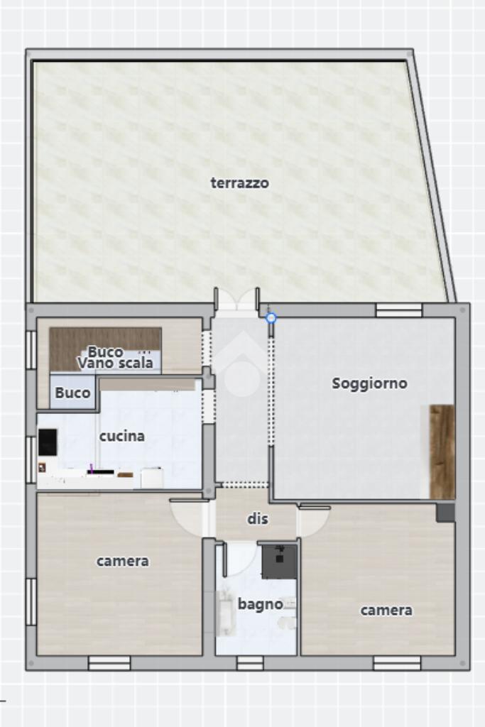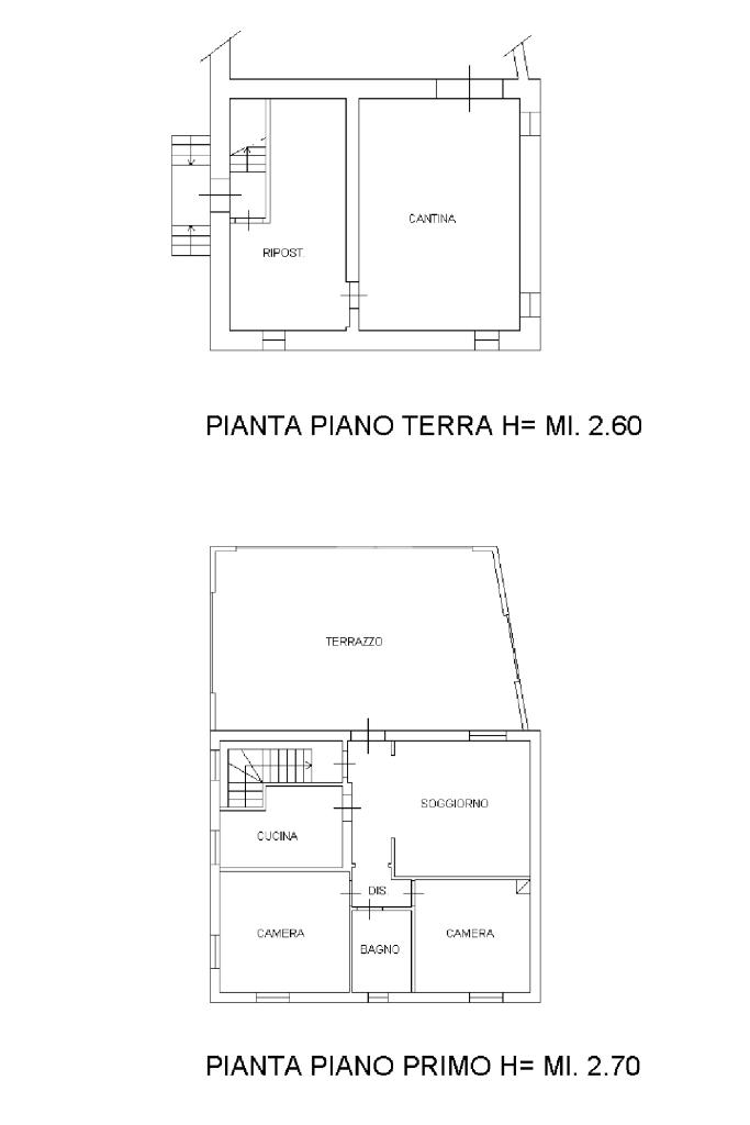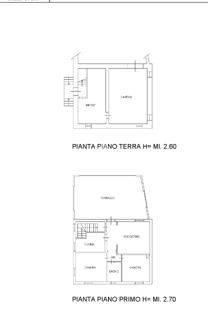 Primo piano: cucina, soggiorno con accesso al terrazzo, bagno e due camere da letto