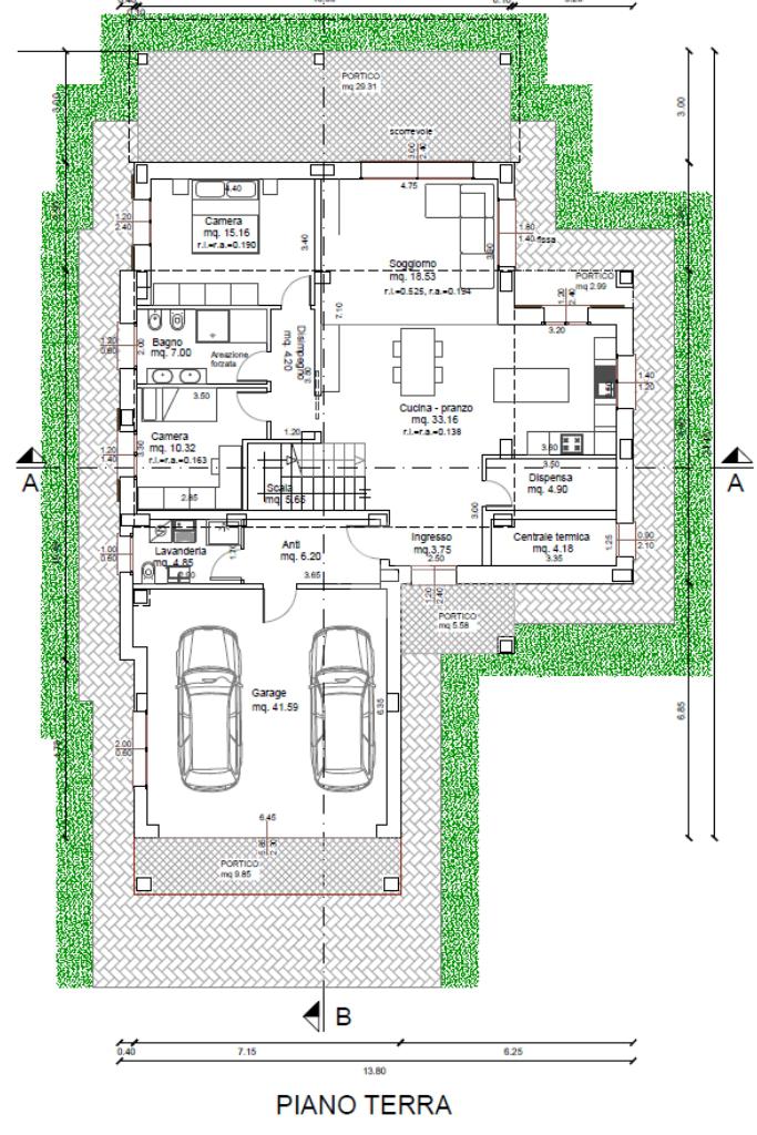 Piano terra: ampio garage doppio, soggiorno luminoso con cucina, due camere da letto e un bagno.